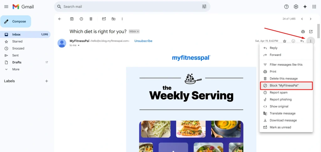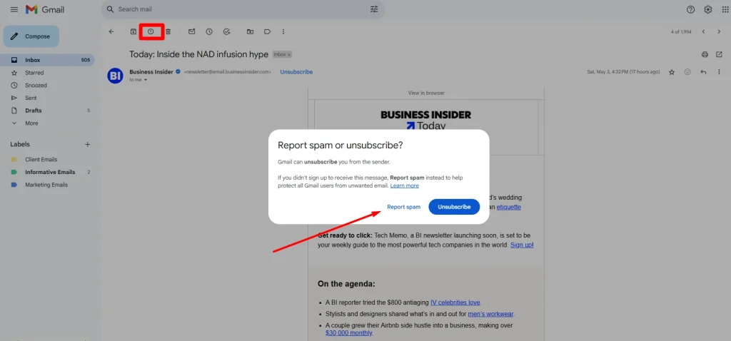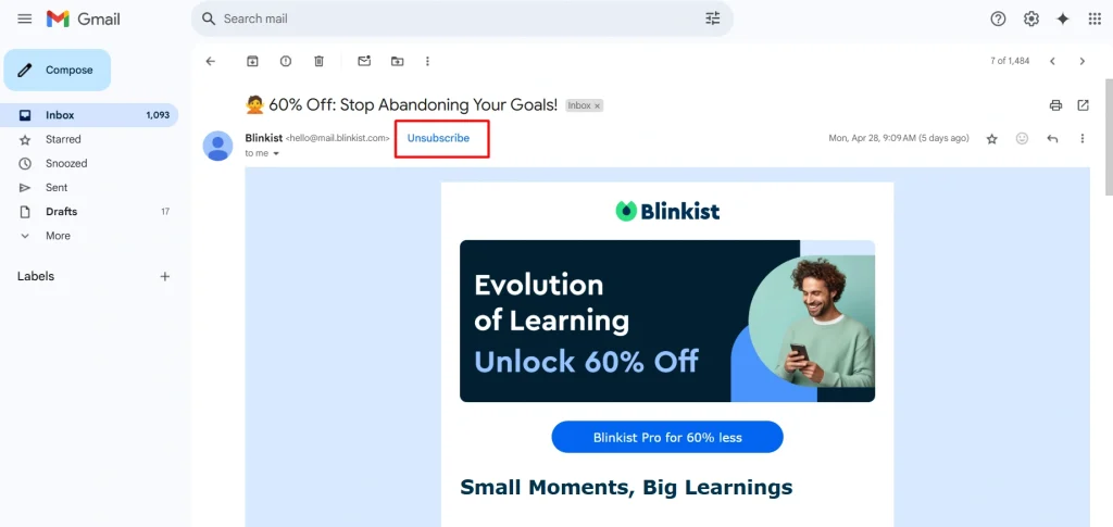 - If you use Gmail, you also might notice an “Unsubscribe” option next to the sender’s name at the top of the email.